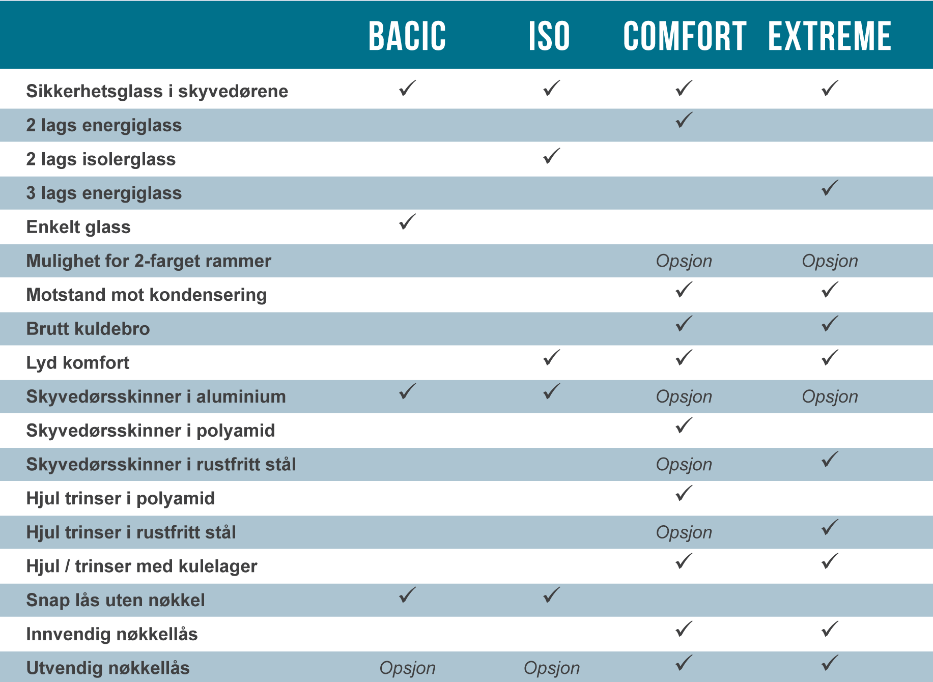 Basic leveres med uisolerte aluminiumsprofiler og med enkelt eller 2 lags glass og polycarbonatplater med U-verdi på 2,0 i taket. Skyvedørene leveres med innvendig låsetapp uten nøkkel, men utvendig nøkkellås kan bestilles som tillegg.