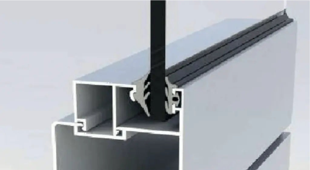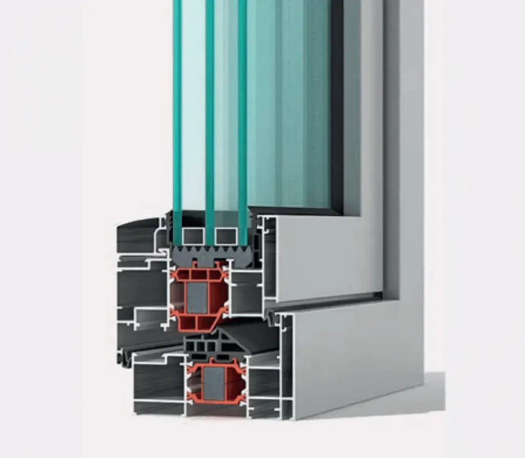 Her er aluminiumsprofilene delt i to og koblet sammen med et isolasjonselement av polyamid. Dette bryter varmeledningen mellom ute og inne.